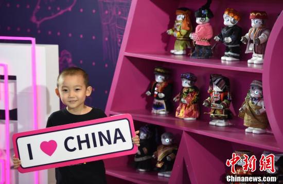 8月23日,一名小朋友在“民族風(fēng)”機器人展區(qū)與展品合影。當天,2019世界機器人大會繼續(xù)在北京亦創(chuàng)國際會展中心舉行。(中新社記者 侯宇 攝)