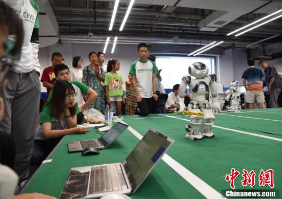 小選手們在2019世界機器人大賽“青少年機器人設(shè)計大賽——綠茵小將賽”比賽中操控自己的機器人。