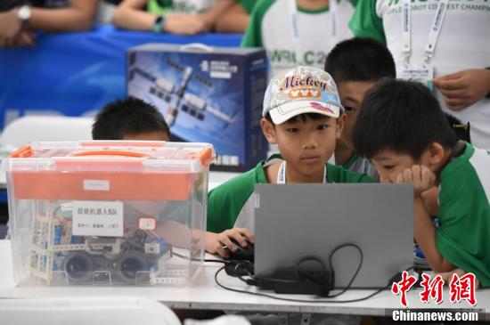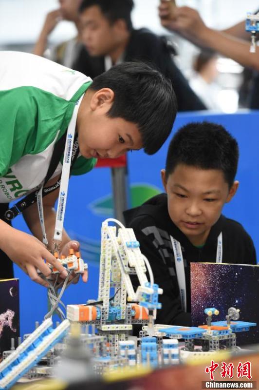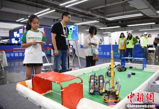 兩名小選手在2019世界機器人大賽“青少年機器人設(shè)計大賽”中操控自己設(shè)計的機器人。