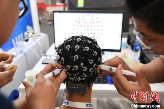 一名參賽選手在2019世界機器人大賽“BCI腦控機器人大賽”比賽中。