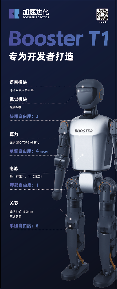 加速進化人形機器人產品Booster T1專為開發者而設計,主打特點是“輕巧靈活、皮實耐摔”。機器人支持全向行走、摔倒爬起、踢球、行走抗擾等運動能力。產品搭載超大AI算力,內置大模型;開發者友好,為開發者提供高效易用的開發工具。產品旨在成為“具身智能”的最佳載體。
