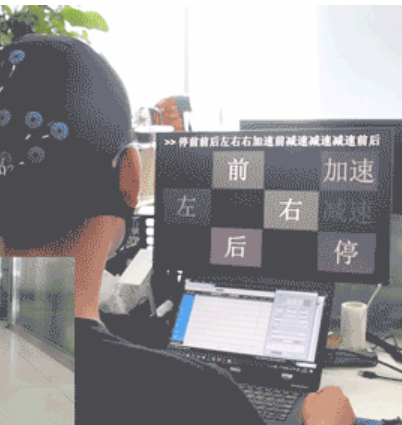 清華大學(xué)神經(jīng)工程實(shí)驗(yàn)室研發(fā)的腦-機(jī)接口基于穩(wěn)態(tài)視覺誘發(fā)電位,在接受按一定頻率閃爍的視覺刺激后,人腦的枕區(qū)能檢測到含有和刺激頻率同頻和倍頻成分的頭皮腦電,這種借口具有穩(wěn)定易用,ITR高,無創(chuàng)安全的優(yōu)點(diǎn),非常適合用于該控制系統(tǒng)。不同于傳統(tǒng)腦機(jī)接口機(jī)器人常采用的同步控制法——用戶需要時刻注視屏幕,缺乏自由性和主動性,清華大學(xué)的系統(tǒng)采用實(shí)驗(yàn)室提出的異步MSMP空間濾波器組算法進(jìn)行異步控制。
